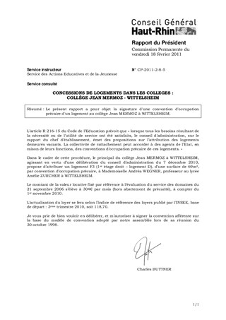 Le présent rapport a pour objet la signature d'une convention d'occupation précaire d'un logement au collège Jean MERMOZ à WITTELSHEIM.