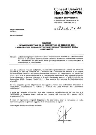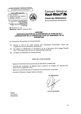 ASECOHR - INDIVIDUALISATION DE LA SUBVENTION AU TITRE DE 2011 - APPROBATION DE LA CONVENTION POUR LE VERSEMENT DE LA SUBVENTION. Resumé Pièces jointes DELIBERATION RAPPORT Assemblée : Commission Permanente Date : 18/02/2011 Rapporteur : Non défini Collectivité : Conseil départemental du Haut-Rhin Direction : Non défini Service : Cabinet Domaine : Aides / Subventions Commission : Commission Permanente
