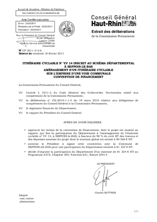 ITINÉRAIRE CYCLABLE N° VV 14 INSCRIT AU SCHÉMA DÉPARTEMENTAL À SEPPOIS-LE-BAS ------ AMÉNAGEMENT D'UN ITINÉRAIRE CYCLABLE SUR L'EMPRISE D'UNE VOIE COMMUNALE ------ CONVENTION DE FINANCEMENT
