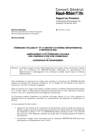 Le présent rapport a pour objet d’approuver les termes d’une convention à passer avec la Commune de SEPPOIS-LE-BAS définissant la participation du Département à l'aménagement d'un itinéraire cyclable inscrit dans le Schéma départemental .