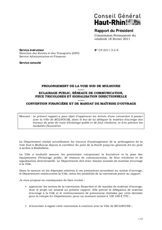 PROLONGEMENT DE LA VOIE SUD DE MULHOUSE------ECLAIRAGE PUBLIC, RÉSEAUX DE COMMUNICATION, FEUX TRICOLORES ET SIGNALISATION DIRECTIONNELLE------CONVENTION FINANCIÈRE ET DE MANDAT DE MAÎTRISE D'OUVRAGE
