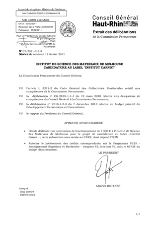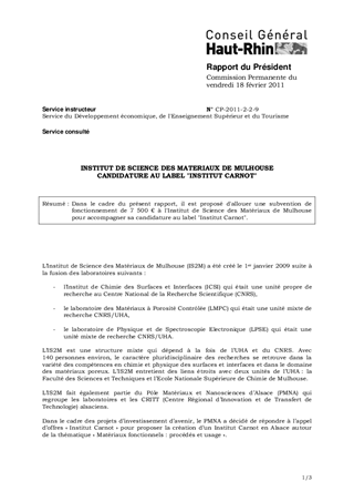 Dans le cadre du présent rapport, il est proposé d'allouer une subvention de fonctionnement de 7 500 € à l'Institut de Science des Matériaux de Mulhouse pour accompagner sa candidature au label "Institut Carnot".