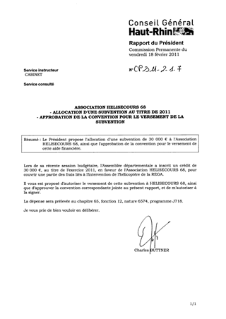 ASSOCIATION HELISECOURS 68 - ALLOCATION D'UNE SUBVENTION AU TITRE DE 2011 - APPROBATION DE LA CONVENTION POUR LE VERSEMENT DE LA SUBVENTION. Resumé Pièces jointes DELIBERATION RAPPORT Assemblée : Commission Permanente Date : 18/02/2011 Rapporteur : Non défini Collectivité : Conseil départemental du Haut-Rhin Direction : Non défini Service : Cabinet Domaine : Aides / Subventions Commission : Commission Permanente