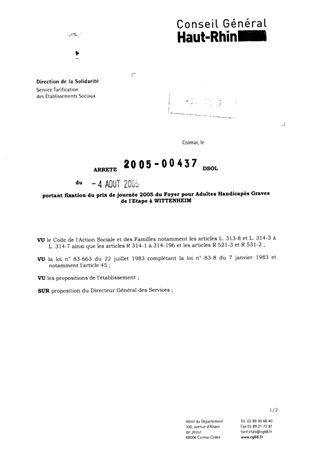portant fixation du prix de journée 2005 du foyer pour adultes handicapés graves à l'étape à WITTENHEIM. Resumé Pièces jointes ARRETE Assemblée : Non défini Date : 04/08/2005 Rapporteur : Non défini Collectivité : Conseil départemental du Haut-Rhin Direction : Non défini Service : Service de la Tarification des Etablissements Domaine : Prix de Journée Commission :