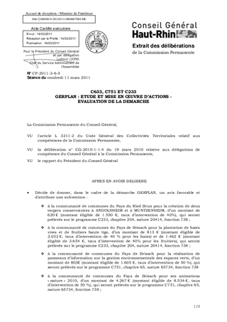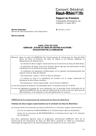 Dans le cadre du GERPLAN des Communautés de Communes du Pays du Ried Brun, du Pays de Brisach, du Pays de Thann et du Secteur d’Illfurth, le Département est sollicité pour : - la création de deux vergers conservatoires sur le territoire du Pays du Ried Brun, - la plantation de haies vives et de fruitiers haute tige par des particuliers et des communes sur le territoire du Pays de Brisach, - la réalisation de panneaux d’information sur la gestion environnementale des espaces verts au Pays de Brisach, - les animations « nature » 2010 au Pays de Brisach, - la remise en état et la plantation de fruitiers sur le verger communal de Bourbach le-Haut (2ème tranche), - les animations « nature gourmande » sur le secteur d’Illfurth. Il vous est proposé de financer ces demandes pour un montant total de 10 300 €. Il vous est également proposé de vous prononcer sur le principe d’une évaluation de la démarche GERPLAN afin de mesurer l’efficacité de sa mise en œuvre ainsi que les effets produits, et de préparer la nouvelle génération de contrats.