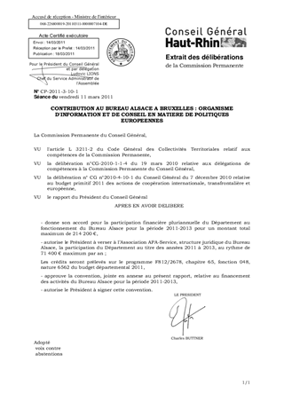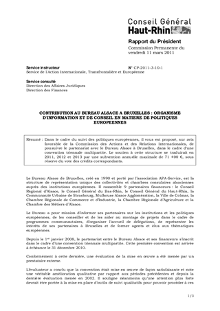 Dans le cadre du suivi des politiques européennes, il vous est proposé, sur avis favorable de la Commission des Actions et des Relations Internationales, de pousuivre le partenariat avec le Bureau Alsace à Bruxelles, dans le cadre d'une convention triennale multipartite. Le soutien à cette structure se traduirait en 2011, 2012 et 2013 par une subvention annuelle maximale de 71 400 €, sous réserve du vote des crédits correspondants.