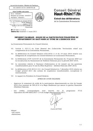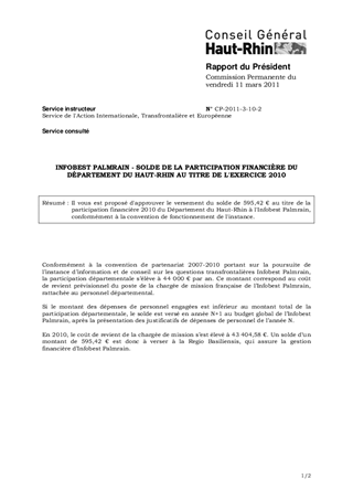 INFOBEST PALMRAIN - SOLDE DE LA PARTICIPATION FINANCIÈRE DU DÉPARTEMENT DU HAUT-RHIN AU TITRE DE L'EXERCICE 2010