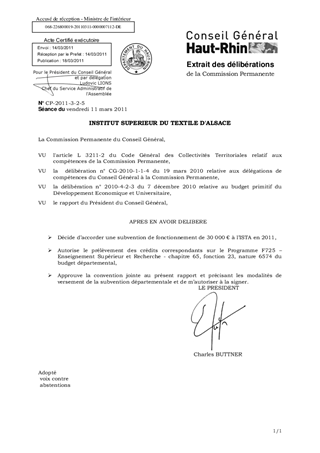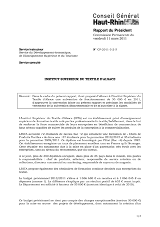 Dans le cadre du présent rapport, il est proposé d'allouer à l'Institut Supérieur du Textile d'Alsace une subvention de fonctionnement de 30 000 € en 2011, d'approuver la convention jointe au présent rapport et précisant les modalités de versement de la subvention départementale et de m'autoriser à la signer.