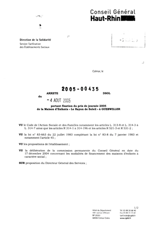 portant fixation du prix de journée 2005 de la Maison d'Enfants "Le Rayon de Soleil" à GUEBWILLER. Resumé Pièces jointes ARRETE Assemblée : Non défini Date : 04/08/2005 Rapporteur : Non défini Collectivité : Conseil départemental du Haut-Rhin Direction : Non défini Service : Service de la Tarification des Etablissements Domaine : Prix de Journée Commission :
