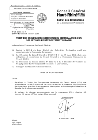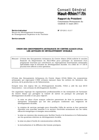 L'Union des Groupements Artisanaux du Centre Alsace (UGA) sollicite le soutien financier du Département du Haut-Rhin pour participer au lancement d'un programme d'actions qui contribuera au regroupement d'entreprises artisanales spécialisées dans le domaine du développement durable. Un crédit de 14 100 € pourrait être affecté à cette opération.
