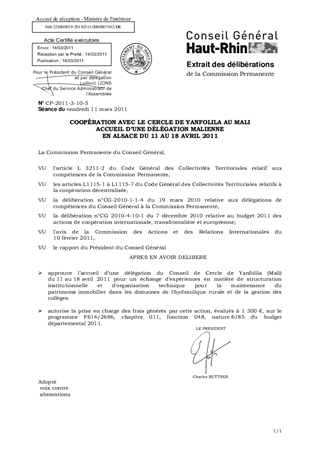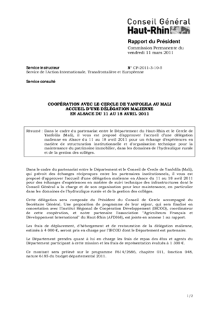 Dans le cadre du partenariat entre le Département du Haut-Rhin et le Cercle de Yanfolila (Mali), il vous est proposé d’approuver l'accueil d’une délégation malienne en Alsace du 11 au 18 avril 2011 pour un échange d’expériences en matière de structuration institutionnelle et d'organisation technique pour la maintenance du patrimoine immobilier, dans les domaines de l'hydraulique rurale et de la gestion des collèges.