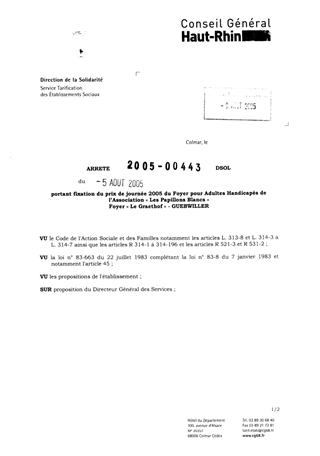 portant fixation du prix de journée 2005 du foyer pour adultes handicapés de l'Association "Les Papillons Blancs" Foyer "Le Graethof" - GUEBWILLER. Resumé Pièces jointes ARRETE Assemblée : Non défini Date : 05/08/2005 Rapporteur : Non défini Collectivité : Conseil départemental du Haut-Rhin Direction : Non défini Service : Service de la Tarification des Etablissements Domaine : Prix de Journée Commission :