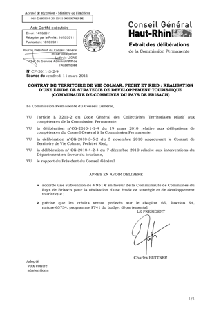Il est proposé d'accorder, dans le cadre du Contrat de Territoire de Vie Colmar, Fecht et Ried, une subvention de 4 951 € en faveur de la Communauté de Communes du Pays de Brisach pour la réalisation d'une étude de stratégie et de développement touristique.
