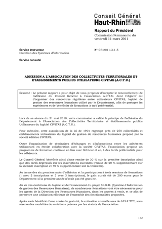 Le présent rapport a pour objet de vous proposer d’accepter le renouvellement de l’adhésion du Conseil Général à l’association A.C.T.U. dont l’objectif est d’organiser des rencontres régulières entre utilisateurs CIVITAS, logiciel de gestion des ressources humaines utilisé par le Département, afin de partager les expériences et de bénéficier de formations à tarif préférentiel.