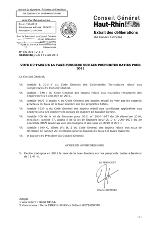 Dans le cadre des dispositions du Code Général des Impôts relatives au vote par les conseils généraux du taux de la taxe foncière sur les propriétés bâties, il est proposé à notre Assemblée : - de fixer le taux d’imposition de cette taxe pour 2011.