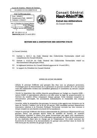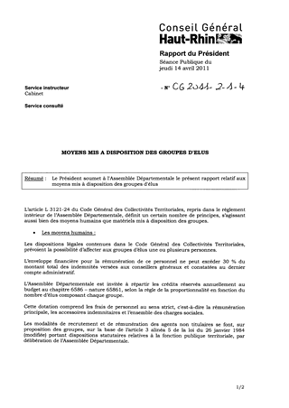 MOYENS MIS A DISPOSITION DES GROUPES D'ELUS Resumé Pièces jointes DELIBERATION RAPPORT Assemblée : Conseil General Date : 14/04/2011 Rapporteur : Non défini Collectivité : Conseil départemental du Haut-Rhin Direction : Non défini Service : Cabinet Domaine : Administration Commission : Assemblée Départementale