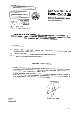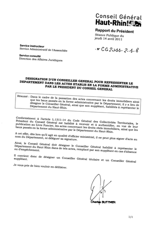 DESIGNATION D'UN CONSEILLER GENERAL POUR REPRESENTER LE DEPARTEMENT DANS LES ACTES ETABLIS EN LA FORME ADMINISTRATIVE PAR LE PRESIDENT DU CONSEIL GENERAL Resumé Pièces jointes DELIBERATION RAPPORT Assemblée : Conseil General Date : 14/04/2011 Rapporteur : Non défini Collectivité : Conseil départemental du Haut-Rhin Direction : Non défini Service : Service Administratif de l'Assemblée Domaine : Administration Commission : Assemblée Départementale