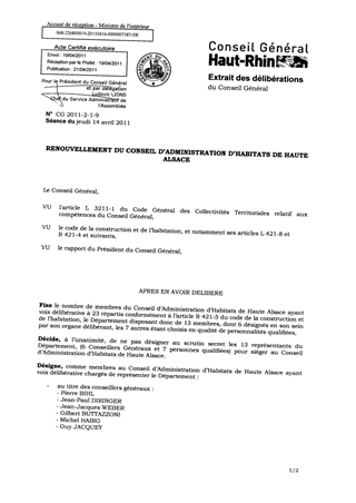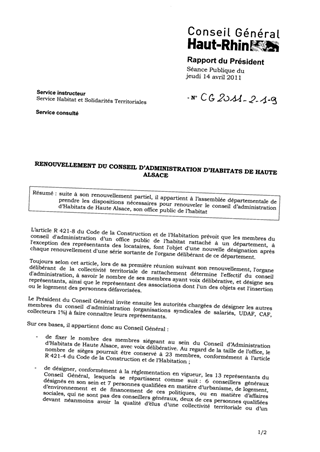 RENOUVELLEMENT DU CONSEIL D'ADMINISTRATION D'HABITATS DE HAUTE ALSACE Resumé Pièces jointes DELIBERATION RAPPORT Assemblée : Conseil General Date : 14/04/2011 Rapporteur : Non défini Collectivité : Conseil départemental du Haut-Rhin Direction : Non défini Service : Service Habitat et Solidarités Territoriales Domaine : Administration Commission : Assemblée Départementale