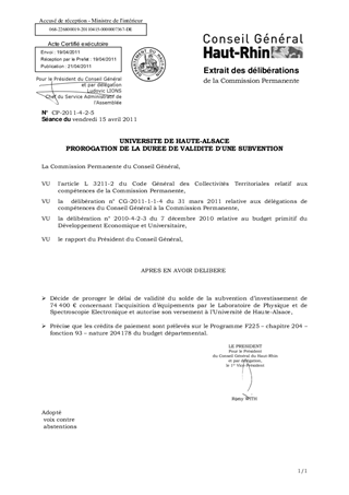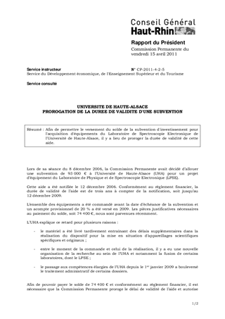 UNIVERSITE DE HAUTE-ALSACE PROROGATION DE LA DUREE DE VALIDITE D'UNE SUBVENTION