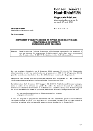 SUBVENTION D’INVESTISSEMENT EN FAVEUR DES BIBLIOTHEQUES COMMUNALES DE PROXIMITE. PROCEDURE GUIDE DES AIDES.