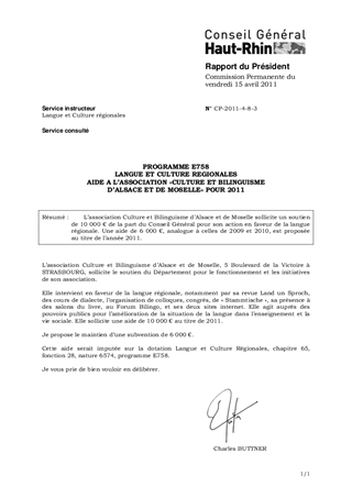 PROGRAMME E758 LANGUE ET CULTURE REGIONALES AIDE A L’ASSOCIATION «CULTURE ET BILINGUISME D’ALSACE ET DE MOSELLE» POUR 2011