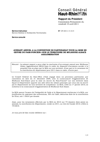 Le présent rapport a pour objet la conclusion d’un avenant annuel avec Mulhouse Alsace Agglomération (M2A) dans le cadre du dispositif d’accession sociale à la propriété mis en place par la M2A sur son territoire, d’une part et le versement de la contribution du département pour 2011 dans ce cadre, d’autre part.