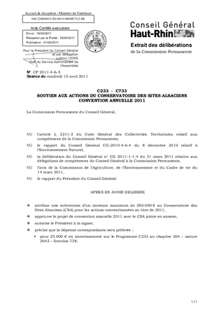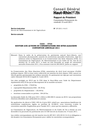 C233 - C733 SOUTIEN AUX ACTIONS DU CONSERVATOIRE DES SITES ALSACIENS CONVENTION ANNUELLE 2011