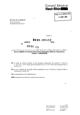 portant fixation du prix de journée 2005 du service d'aides éducatives en milieu ouvert (AEMO) et d'actions éducatives demandées (AED) de l'association "Espoir" à MULHOUSE. Resumé Pièces jointes ARRETE Assemblée : Non défini Date : 16/08/2005 Rapporteur : Non défini Collectivité : Conseil départemental du Haut-Rhin Direction : Non défini Service : Service de la Tarification des Etablissements Domaine : Prix de Journée Commission :