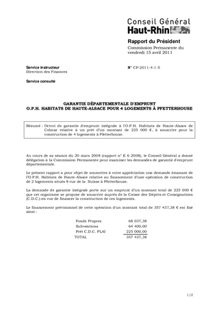 GARANTIE DÉPARTEMENTALE D'EMPRUNT O.P.H. HABITATS DE HAUTE-ALSACE POUR 4 LOGEMENTS À PFETTERHOUSE