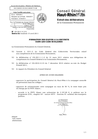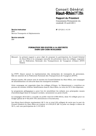 Le présent rapport a pour objet de proposer la participation du Conseil Général du Haut-Rhin à la campagne annuelle de prévention dans les collèges, organisée par la Fédération Nationale des Transporteurs de Voyageurs d'Alsace (FNTV Alsace)