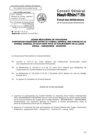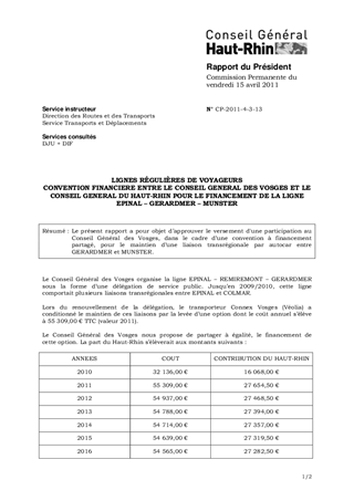 LIGNES RÉGULIÈRES DE VOYAGEURS CONVENTION FINANCIERE ENTRE LE CONSEIL GENERAL DES VOSGES ET LE CONSEIL GENERAL DU HAUT-RHIN POUR LE FINANCEMENT DE LA LIGNE EPINAL – GERARDMER – MUNSTER