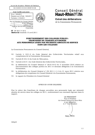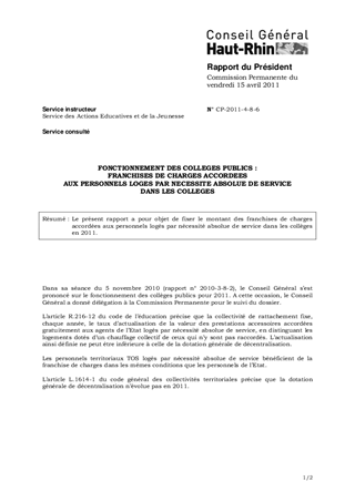 Le présent rapport a pour objet de fixer le montant des franchises de charges accordées aux personnels logés par nécessité absolue de service dans les collèges en 2011.