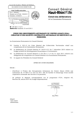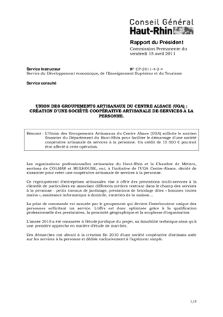 L'Union des Groupements Artisanaux du Centre Alsace (UGA) sollicite le soutien financier du Département du Haut-Rhin pour faciliter le démarrage d'une société coopérative artisanale de services à la personne. Un crédit de 15 000 € pourrait être affecté à cette opération.