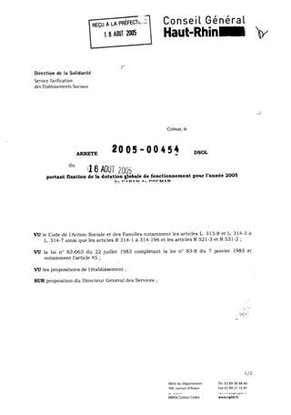 portant fixation de la dotation globale de fonctionnement pour l'année 2005 du CARAH de COLMAR. Resumé Pièces jointes ARRETE Assemblée : Non défini Date : 16/08/2005 Rapporteur : Non défini Collectivité : Conseil départemental du Haut-Rhin Direction : Non défini Service : Service de la Tarification des Etablissements Domaine : Prix de Journée Commission :
