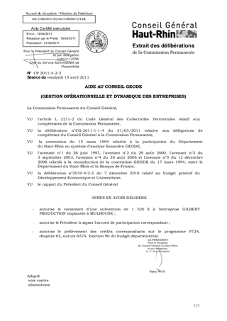 Le Conseil Général a été sollicité au titre du dispositif GEODE (Gestion Opérationnelle et Dynamique des Entreprises) par l'entreprise GILBERT PRODUCTION pour un montant de 1 520 €.