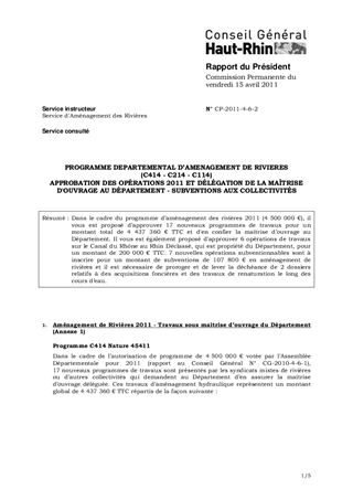 Dans le cadre du programme d’aménagement des rivières 2011 (4 500 000 €), il vous est proposé d’approuver 17 nouveaux programmes de travaux pour un montant total de 4 437 360 € TTC et d'en confier la maîtrise d’ouvrage au Département. Il vous est également proposé d'approuver 6 opérations de travaux sur le Canal du Rhône au Rhin Déclassé, qui est propriété du Département, pour un montant de 200 000 € TTC. 7 nouvelles opérations subventionnables sont à inscrire pour un montant de subventions de 107 800 € en aménagement de rivières et il est nécessaire de proroger et de lever la déchéance de 2 dossiers relatifs à des acquisitions foncières et des travaux de renaturation le long des cours d’eau.