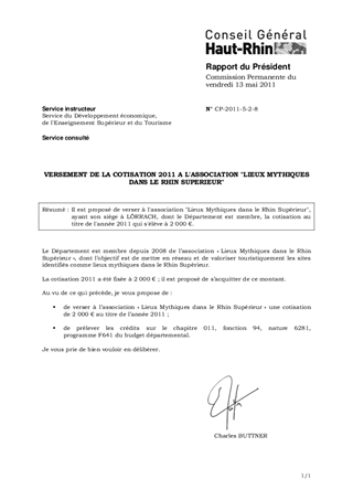Il est proposé de verser à l'association "Lieux Mythiques dans le Rhin Supérieur", ayant son siège à LÖRRACH, dont le Département est membre, la cotisation au titre de l'année 2011 qui s'élève à 2 000 €.