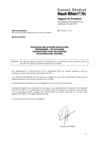 POLITIQUE DES ACTIONS EDUCATIVES PROGRAMME : VIE SCOLAIRE SUBVENTIONS POUR LES SORTIES SCOLAIRES AVEC NUITEES