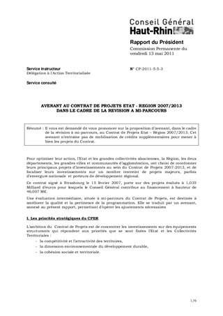 Il vous est demandé de vous prononcer sur la proposition d’avenant, dans le cadre de la révision à mi-parcours, au Contrat de Projets Etat – Région 2007/2013. Cet avenant n’entraîne pas de mobilisation de crédits supplémentaires pour mener à bien les projets du Contrat.