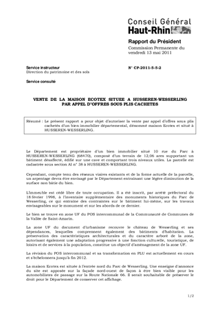 Le présent rapport a pour objet d’autoriser la vente par appel d’offres sous plis cachetés d’un bien immobilier départemental, dénommé maison Ecotex et situé à HUSSEREN-WESSERLING.