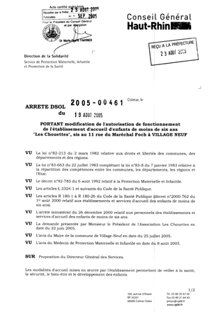 portant modification de l'autorisation de fonctionnement de l'établissement d'accueil d'enfants de moins de six ans "Les Chouettes", sis au 11 rue du Maréchal Foch à VILLAGE-NEUF. Resumé Pièces jointes ARRETE Assemblée : Non défini Date : 19/08/2005 Rapporteur : Non défini Collectivité : Conseil départemental du Haut-Rhin Direction : Non défini Service : Service de Protection Maternelle et Infantile Domaine : Accueil d'enfants Commission :