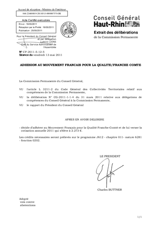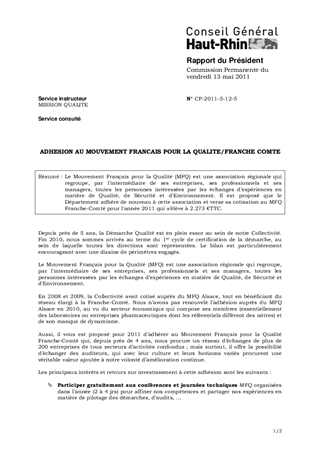 Le Mouvement Français pour la Qualité (MFQ) est une association régionale qui regroupe, par l'intermédiaire de ses entreprises, ses professionnels et ses managers, toutes les personnes intéressées par les échanges d’expériences en matière de Qualité, de Sécurité et d'Environnement. Il est proposé que le Département adhère de nouveau à cette association et verse sa cotisation au MFQ Franche-Comté pour l'année 2011 qui s’élève à 2.273 €TTC.