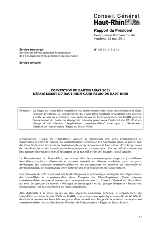 CONVENTION DE PARTENARIAT 2011 DÉPARTEMENT DU HAUT-RHIN-CAHR-REGIO DU HAUT-RHIN