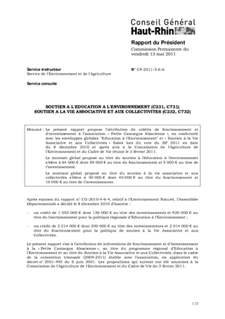 Le présent rapport propose l’attribution de crédits de fonctionnement et d'investissement à l’association « Petite Camargue Alsacienne », en conformité avec les enveloppes globales "Education à l'Environnement" et « Soutien à la Vie Associative et aux Collectivités » fixées lors du vote du BP 2011 en date du 8 décembre 2010 et après avis à la Commission de l'Agriculture de l'Environnement et du Cadre de Vie réunie le 3 février 2011. Le montant global proposé au titre du soutien à l’éducation à l’environnement s’élève à 64 000 € dont 59 000 € au titre du fonctionnement et 5 000 € au titre de l’investissement. Le montant global proposé au titre du soutien à la vie associative et aux collectivités s’élève à 50 000 € dont 40 000 € au titre du fonctionnement et 10 000 € au titre de l’investissement.