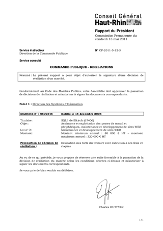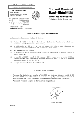 COMMANDE PUBLIQUE - RESILIATIONS Resumé Le présent rapport a pour objet d'autoriser la signature d'une décision de résiliation d'un marché. Pièces jointes DELIBERATION RAPPORT Assemblée : Commission Permanente Date : 13/05/2011 Rapporteur : Non défini Collectivité : Conseil départemental du Haut-Rhin Direction : Non défini Service : Service de la Commande Publique Domaine : Administration Commission : Commission Permanente