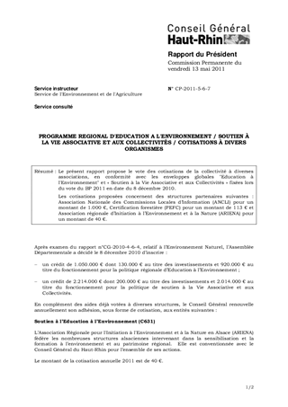PROGRAMME REGIONAL D'EDUCATION A L'ENVIRONNEMENT / SOUTIEN À LA VIE ASSOCIATIVE ET AUX COLLECTIVITÉS / COTISATIONS À DIVERS ORGANISMES