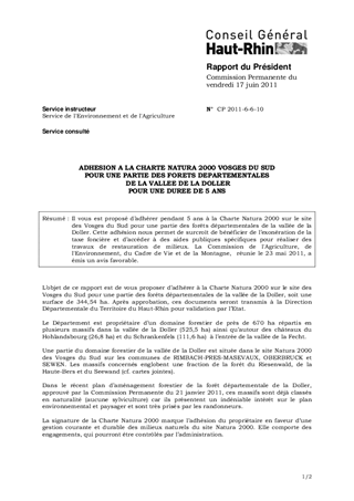 Il vous est proposé d’adhérer pendant 5 ans à la Charte Natura 2000 sur le site des Vosges du Sud pour une partie des forêts départementales de la vallée de la Doller. Cette adhésion nous permet de surcroît de bénéficier de l’exonération de la taxe foncière et d’accéder à des aides publiques spécifiques pour réaliser des travaux de restauration de milieux. La Commission de l'Agriculture, de l'Environnement, du Cadre de Vie et de la Montagne, réunie le 23 mai 2011, a émis un avis favorable.