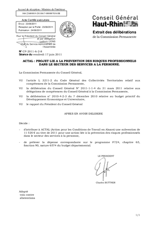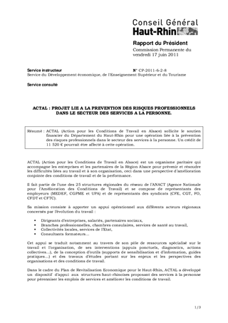 ACTAL (Action pour les Conditions de Travail en Alsace) sollicite le soutien financier du Département du Haut-Rhin pour une opération liée à la prévention des risques professionnels dans le secteur des services à la personne. Un crédit de 11 520 € pourrait être affecté à cette opération.