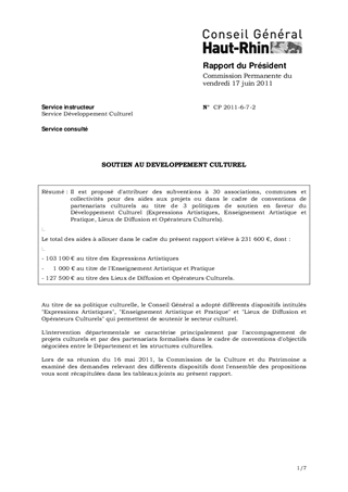 Il est proposé d'attribuer des subventions à 30 associations, communes et collectivités pour des aides aux projets ou dans le cadre de conventions de partenariats culturels au titre de 3 politiques de soutien en faveur du Développement Culturel (Expressions Artistiques, Enseignement Artistique et Pratique, Lieux de Diffusion et Opérateurs Culturels). Le total des aides à allouer dans le cadre du présent rapport s'élève à 231 600 €, dont : - 103 100 € au titre des Expressions Artistiques - 1 000 € au titre de l'Enseignement Artistique et Pratique - 127 500 € au titre des Lieux de Diffusion et Opérateurs Culturels.