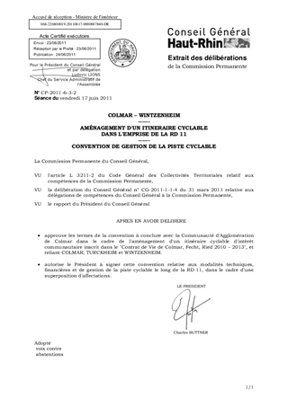 COLMAR – WINTZENHEIM ------ AMÉNAGEMENT D'UN ITINERAIRE CYCLABLE DANS L'EMPRISE DE LA RD 11 ------ CONVENTION DE GESTION DE LA PISTE CYCLABLE